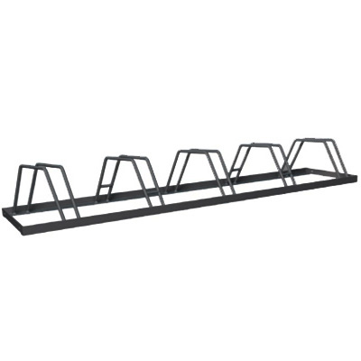 Lakkapäältä maassa makaava polkupyöräteline kotipihalle tai taloyhtiön pihalle. Pyöröteräs rakenne ja maalattu. Musta RR33. Kuvassa 5-paikkainen polkupyöräteline.