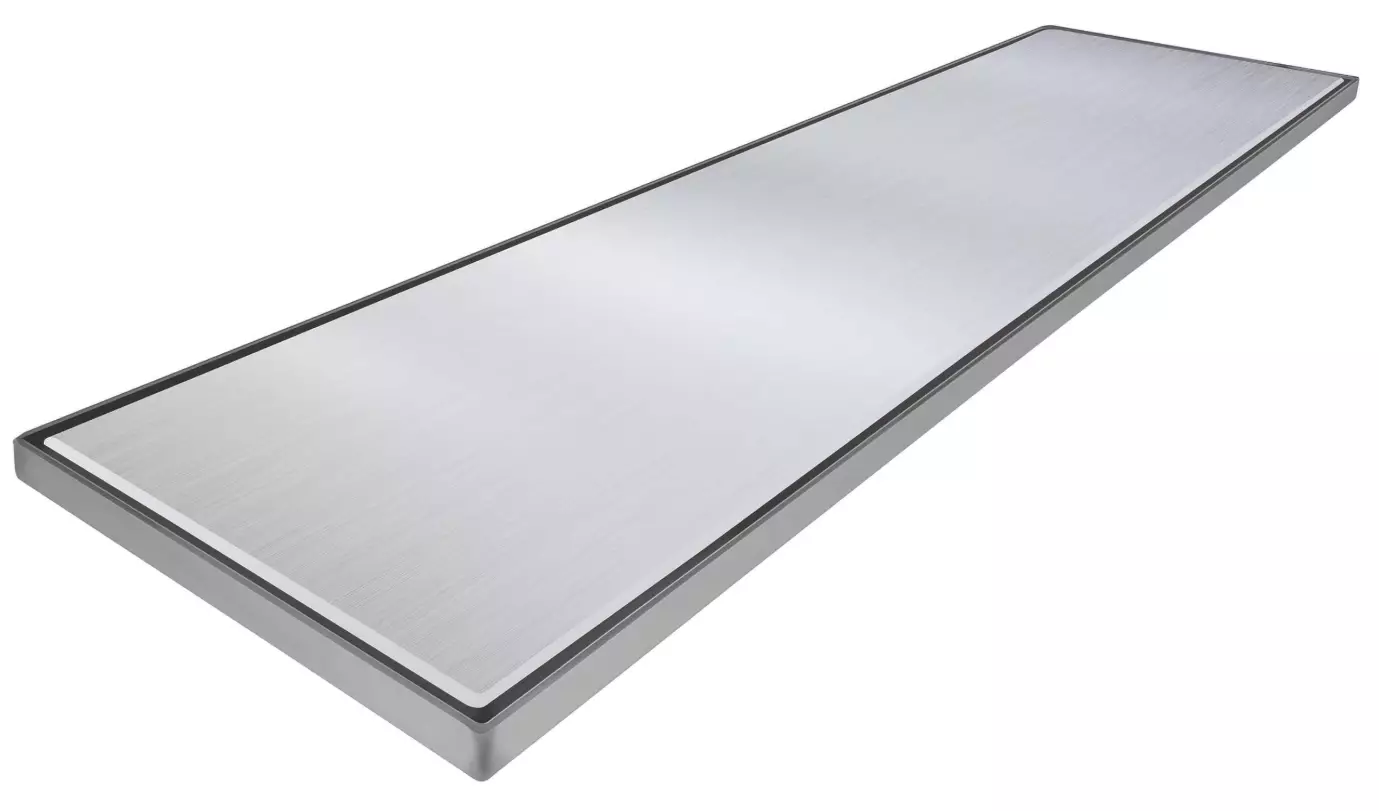 PP-Tuotteen pitkä lattiakaivonkansi on moderni katseenvangitsija kylpyhuoneessa. Tuote sisältää ruostumattomasta teräksestä valmistetun asennuskehyksen lisäksi kannen joko käsittelemättömänä tai mustaksi polttomaalattuna.