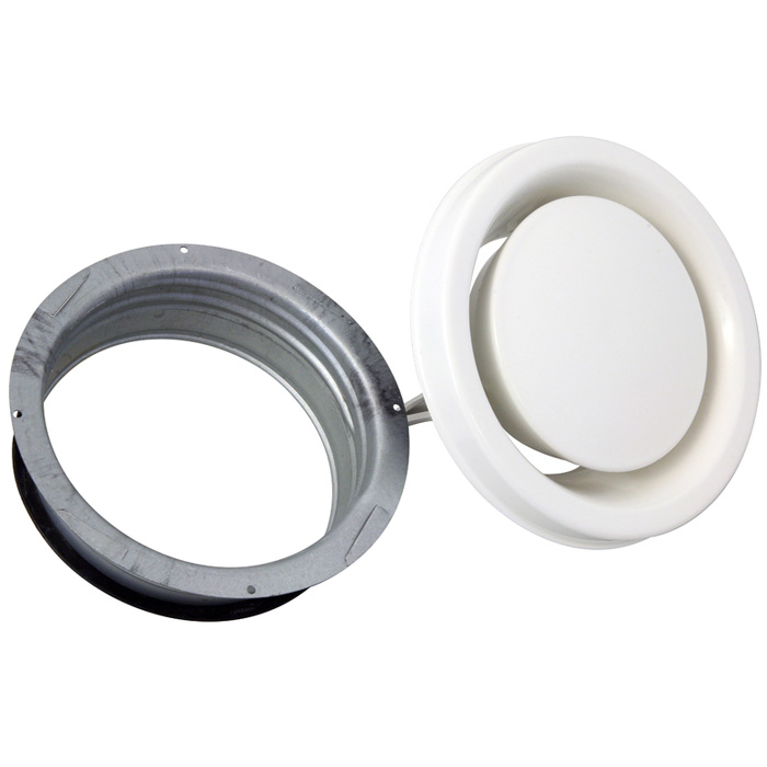 Valkoinen Saunan Metallinen Poistoilmaventtiili Nupilla. Hyvät säätöominaisuudet, Alhainen äänitaso, Hyvät äänenvaimennusominaisuudet, Nopea ja luja asennustapa, Ilmavirta mitattavissa...