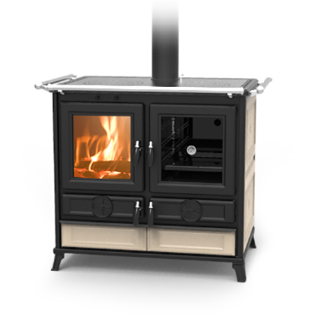 Italialainen Thermorossi Viola puuhella on nopea ruoanlaittaja ja lämmittää huoneen tehokkaasti. Hellan tummanharmaa teräs/valurautapinta on hienosti viimeistelty. Edessä ja sivuilla punaiset tai beiget kaakelit. Tulipesässä ja uunissa valurautaluukut. Uunin sisäpuoli on emaloitu ja uunissa on lämpömittari sekä uunipelti. Uunin alla tila ruoan lämpimänä pitämiselle. Sileäksi koneistettu valurautainen keittolevy on todella tehokas. Kätevässä säilytyslaatikossa voi pitää tarvikkeita ja jalat helpottavat hellan ympärystän puhtaanapitämistä.