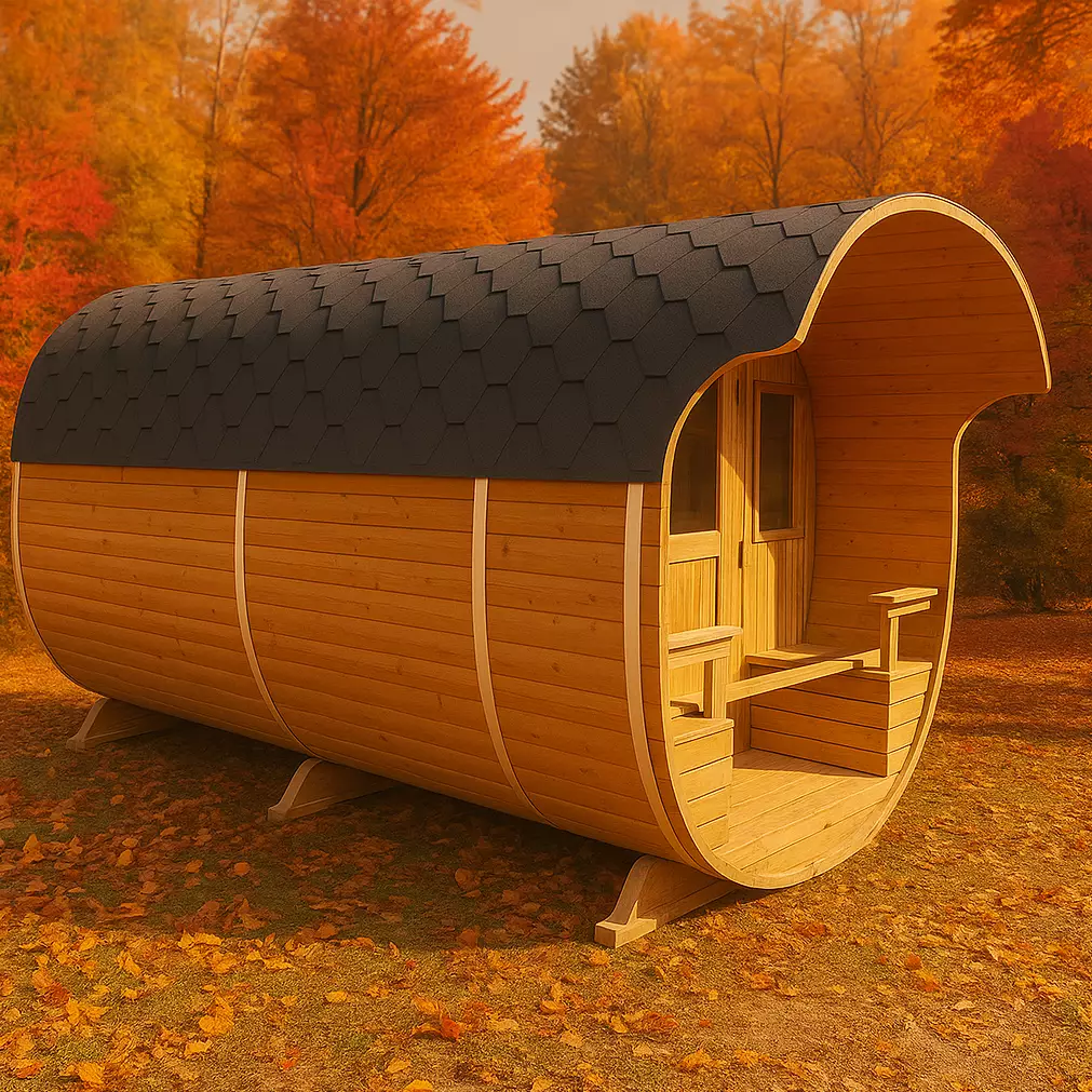Från Lakkapaa.coms webbutik – en riktigt stilig gårdsbastu i oval form! Bastuns diameter är betydligt större än traditionella tunnbastur, vilket ger mer utrymme jämfört med de klassiska runda modellerna. Den större storleken möjliggör även bredare, tvådelade bastulavar som ingår som standard.