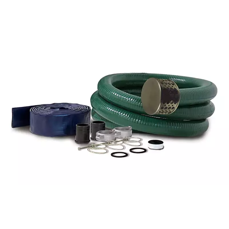Används med både rena och smutsiga vattenpumpar, som har 7,5cm/3in NPT-gängad koppling. Setet innehåller en 3,7m förstärkt PVC-sugslang samt en 7,6m PVC-avloppsslang med tillbehör. Snabb och enkel installation.