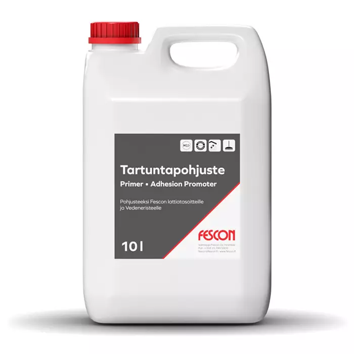Fescon Primer är ett vattenlösligt, syntetiskt gummilatex. Intygsnr VTT-C-870-06. Ger god vidhäftning för Fescon vattentätningsmassa och Fescon avjämningsmassor. Användningsområden: Betong- och cementbaserade avjämningsmassor, gipsskivor, golv med gamla limrester och andra sådana ämnen minskar vidhäftningen.