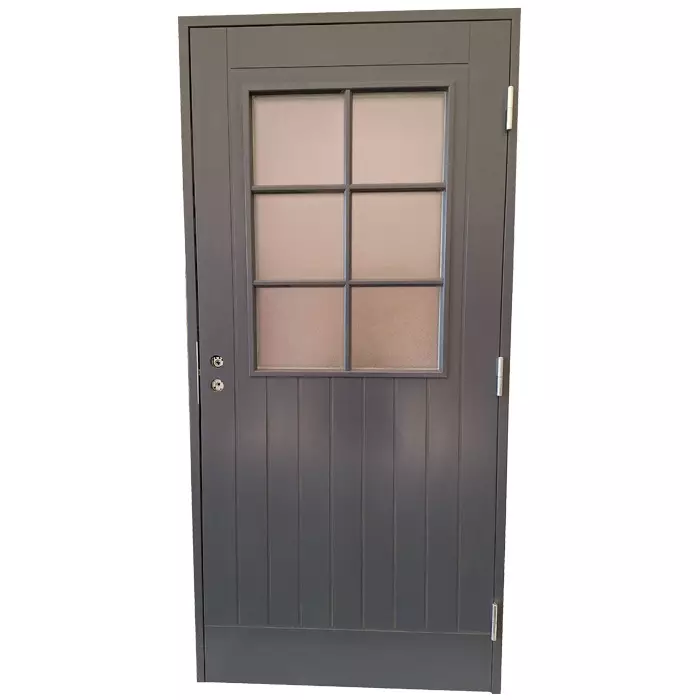 Vertikalprofilad Hilja Lågenergibyggnad Ytterdörr. Ytterdörren har 6 små fyrkantiga fönster. Edux-dörrar är resultatet av långvarig produktutveckling. Dess kvalitet syns i varje liten detalj. Edux-dörrar är robusta, säkra och livlösa i jämförelse med vanliga trädörrar. De är lätta att öppna och stänga – Edux-dörrarnas konstruktion tål utmanande, nordiska klimatförhållanden och även kraftiga temperaturväxlingar. Från generation till generation.