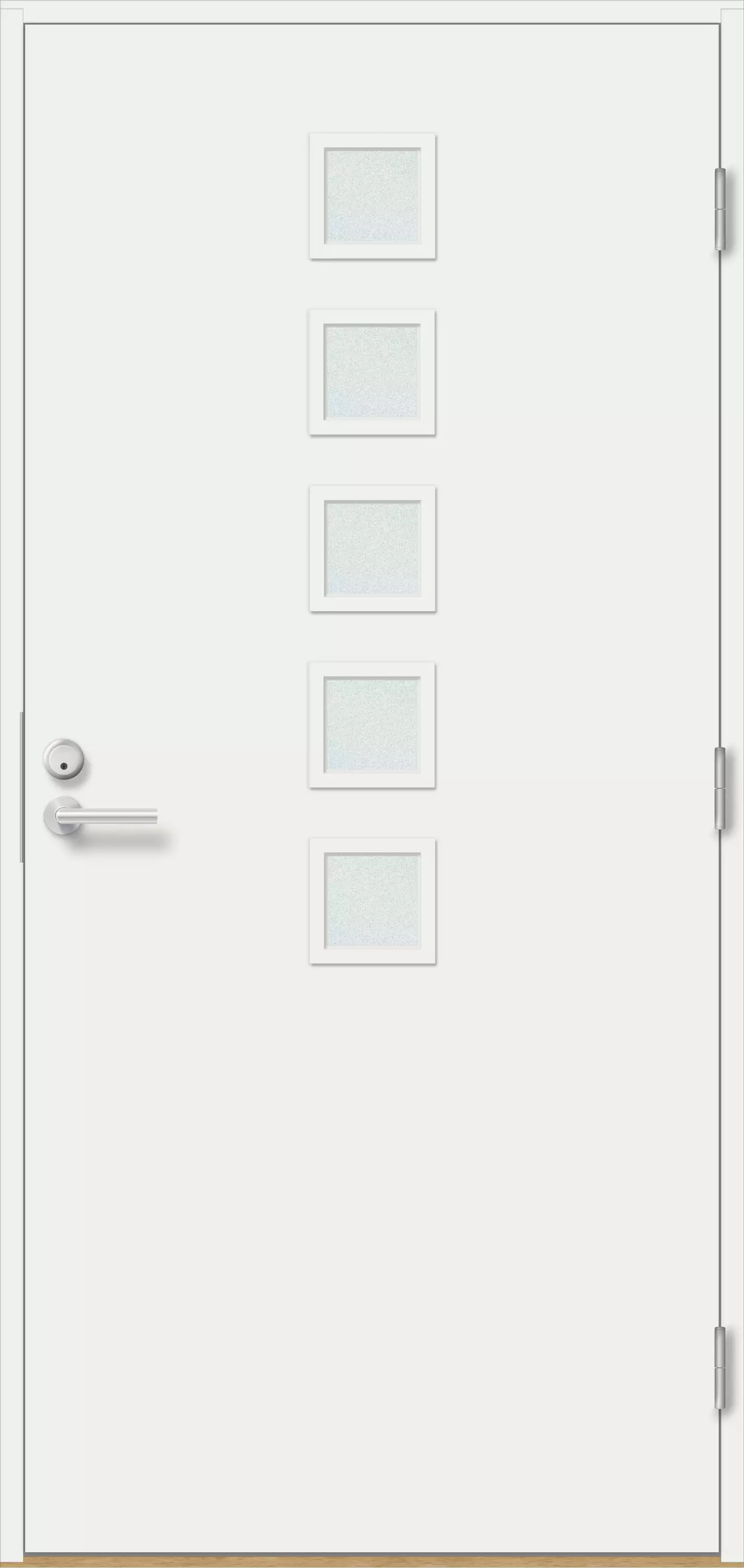 Sulo är en stilren och tidlös ytterdörr som står emot tidens tand och varierande väderförhållanden. Fem små kvadratiska glasfönster i dörrens överdel ger ljus och lätthet till ingångens utseende. Dörrens aluminiumförstärkta, 78 mm tjocka konstruktion och dubbelt tätning håller kylan borta och värmen inne. Sulo är designad för hem som värdesätter energieffektivitet, hållbarhet och kvaliteten av inhemskt arbete.