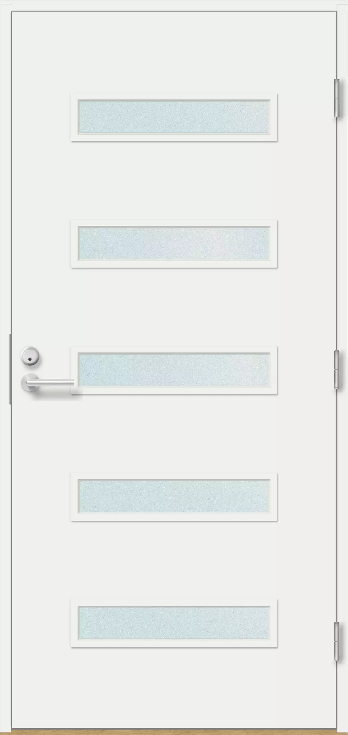 Sakari är en modern och stilren ytterdörr som står emot tidens tand och varierande väderförhållanden. Fem lag av rektangulära rutor bildar en elegant och rytmisk helhet vid ingången. Dörrens aluminiumförstärkta, 78 mm tjocka konstruktion och dubbla tätningar håller kylan borta och värmen inne.