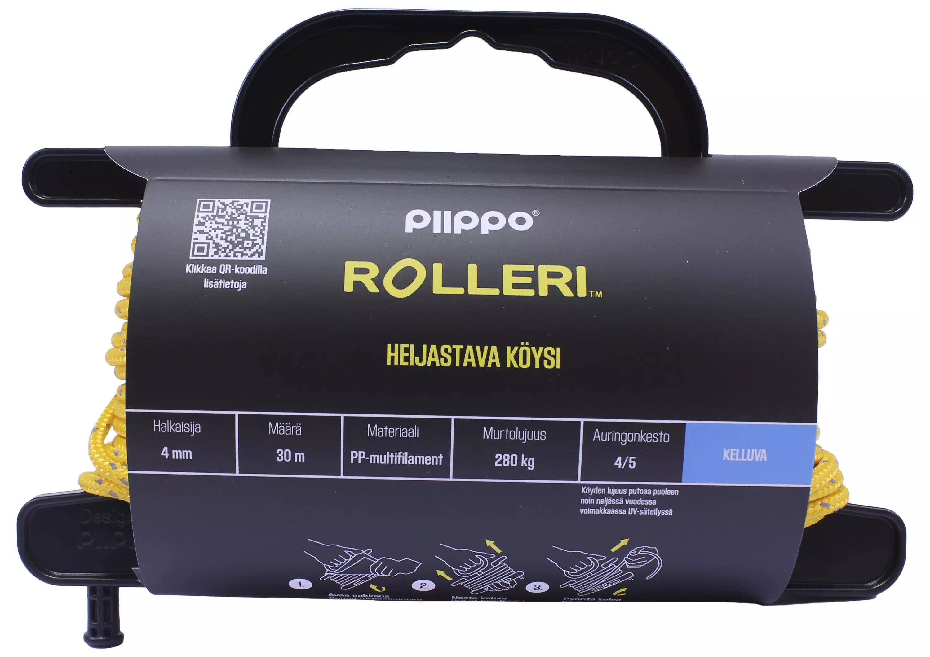 I förpackningen ingår 30 m 4 mm tjockt rep. Med rollern är det enkelt att rulla upp repet inför följande användningsgång. Flytande och reflekterande. Repets hållfasthet sjunker till ungefär hälften på tre år i stark UV-strålning. Brotthållfasthet: 280 kg. Repet har en högkvalitativ reflekterande reflextråd. Reflextråden garanterar synligheten vid mörker. Den reflekterande rollern fungerar bra för att märka ut parkeringsplatser, stolpar eller strömmande ställen. Produkten kan även användas som pulkarep. Den reflekterande produkten lämpar sig för användning i mörker och skymning.