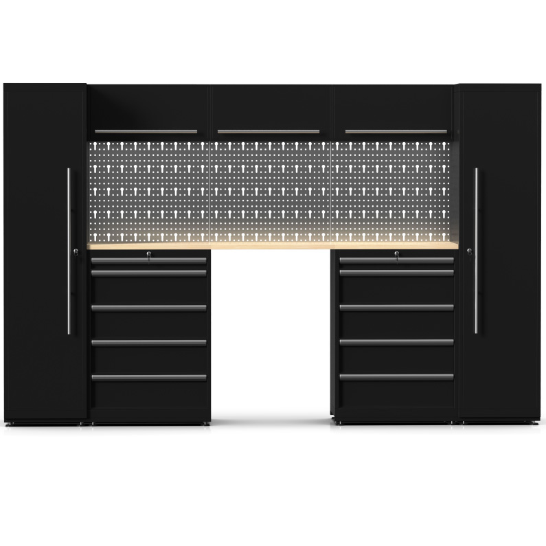 Mellanslag är fullt av en plåtvägg med EURO 9x9 mm hål, där man kan välja att installera krokar, hyllor, bänkar, osv. för verktyg och tillbehör. Både de höga skåpen och lådorna är låsbara. Leveransen inkluderar två nycklar.
