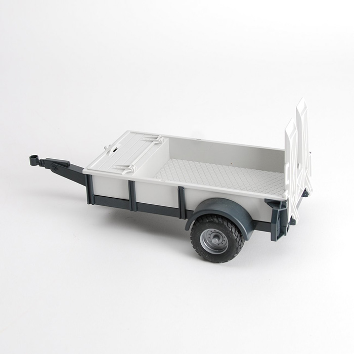Släpkärra från leksaksmärket Bruder. Passar som släpkarra till leksaksbilar. Man kan transportera mindre fordon på denna kärra, så som minigrävmaskin eller motorcykel.
