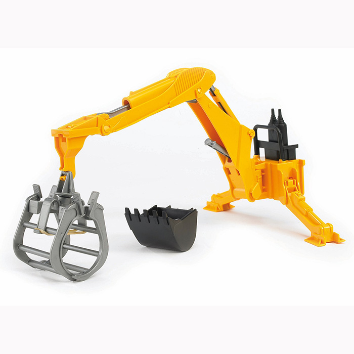 Tillägsdel till Bruder leksaksmärkets leksakstraktorer. Med hjälp av denna förvandlar du traktorn till en grävmaskin. Kranfunktion med grävskopa. Stödben för att kranen skall hållas stabilt på plats. Kan kopplas på alla Profi-seriens traktorer.